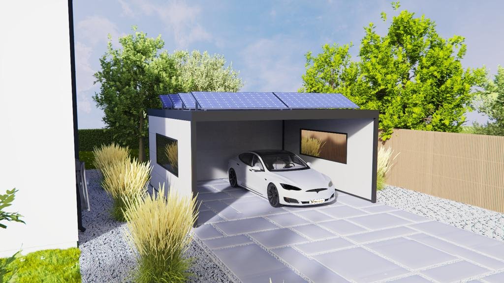 Die Flat Box kann individuell verkleidet werden – z. B. mit Holz, Aluminium-Verbundplatten oder anderen Fassadenelementen – und passt sich somit perfekt an die Architektur Ihres Hauses an. Für zusätzlichen Komfort lässt sich ein Sektionaltor integrieren, wodurch ein geschlossener, sicherer Raum entsteht, der optisch wie eine Garage wirkt, aber die Offenheit und Anpassungsfähigkeit eines Carports bewahrt.