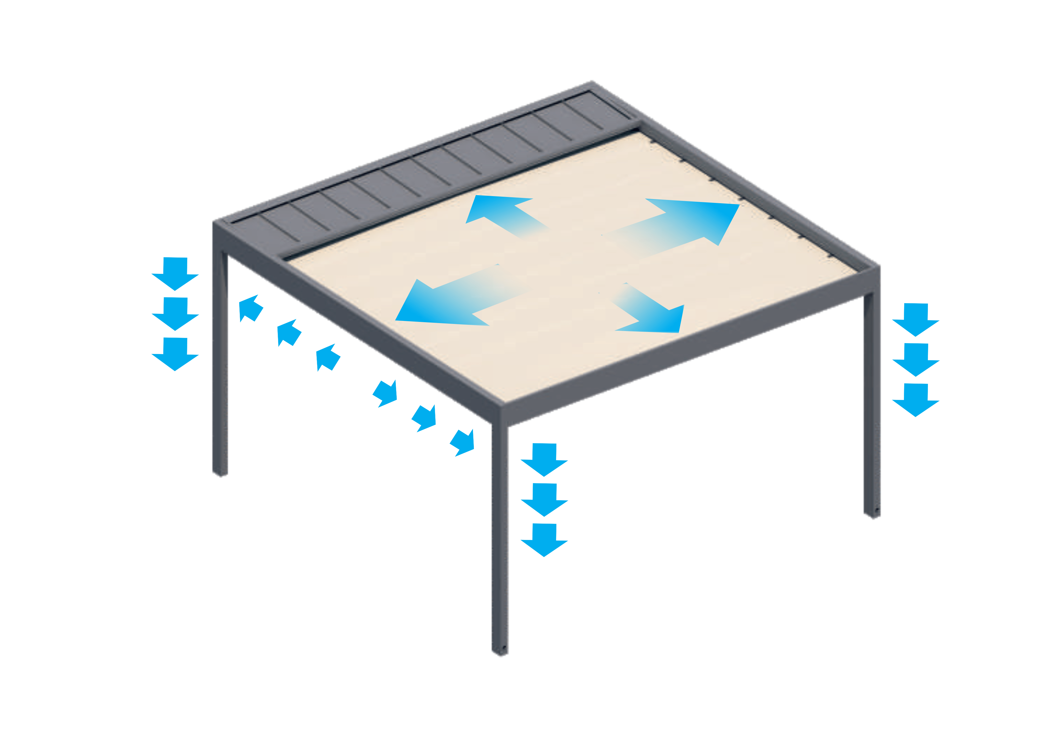 Die Möglichkeit des modularen Aufbaus macht die Konstruktion besonders attraktiv für die Gastronomiebranche. Jedes Modul verfügt über sein eigenes Dach mit einem Doppelschicht-Gewebe und einer automatischen Steuerung, die auch optionale Ausstattungen wie ZIP-Seitenmarkise, Heizstrahler oder Beleuchtung verwaltet.